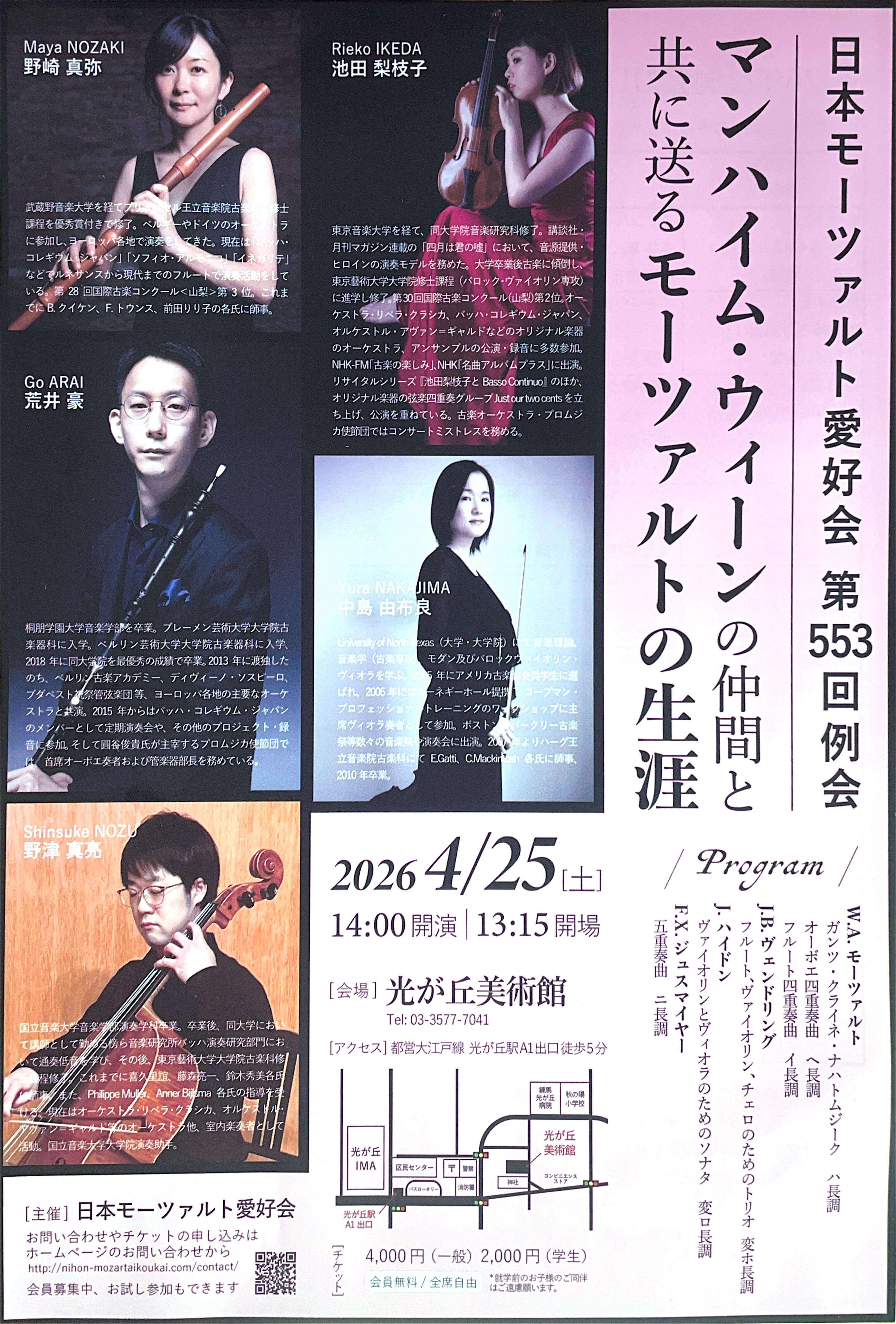 NHK-FM「古楽の楽しみ」やNHK「名曲アルバムプラス」への出演、リサイタルシリーズ『池田梨枝子と Basso Continuo』の開催、オリジナル楽器による弦楽四重奏《Just our two cents》の活動など、多方面にわたり古楽の魅力を発信。現在は《プロムジカ使節団》コンサートマスターとしても活躍し、2024年にはモーツァルトの未発表作品の日本初演を手がけるなど、新たな挑戦を続けている。